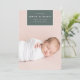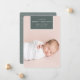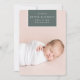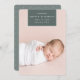 Chic and modern birth announcement features a single full bleed vertical/portrait orientated photo with a rectangular banner element at the top, bearing baby's name, birthdate, and birth stats. Add a personal message to the back, along with an additional photo.