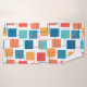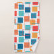 This towel set has a poppy washcloth, a light teal hand towel and a bath towel with a geometric design of squares in tangerine, poppy, coral, and shades of teal scattered about with their outlines.