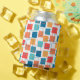 This can cooler has a geometric design of squares in tangerine, poppy, coral, and shades of teal scattered about with their outlines.