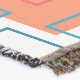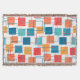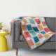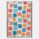 This throw blanket has a geometric design of squares in tangerine, poppy, coral, and shades of teal scattered about with their outlines.