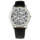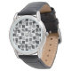 This men's watch has a geometric design of squares in black and shades of grey scattered about with their outlines.