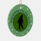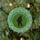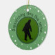 This funny hominid Christmas tree ornament says Squatching thru the snow. It is on a green background that looks like snow.