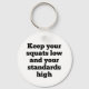 Squats Low Standards High Keychain with a modern and simple typography design saying "Keep your squats low and your standards high" in black. Add your own additional text and/or background color to customize.