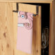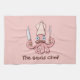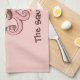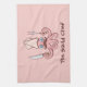 Pink squid chef cartoon with moustache holding knife and cooking fork. Custom background colour. Custom text.
