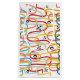 This gift bag has a mid-century modern design of squiggles running vertically in retro colours with black starbursts and circles scattered about the design.