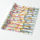 This wrapping paper has a mid-century modern design of squiggles running vertically in retro colours with black starbursts and circles scattered about the design.