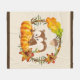 A fleece blanket with a cute squirrel standing behind some orange watercolor pumpkins. A foliage wreath surrounds them with an oak leaf and orange flowers and other sprigs and leaves.
