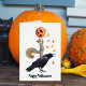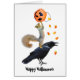 A squirrel stands on a raven and spills candy from a jack-o-lantern bucket on this wildlife Halloween card.