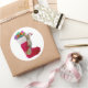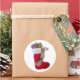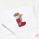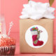 A naughty squirrel climbs up a Christmas stocking full of presents. This cheerful Christmas sticker would make a fun gift tag .