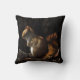 This throw pillow features a moment out of time. A beautiful red squirrel is sitting on a branch in a patch of sunlight in front of the dark textured bark of a wild cherry tree. The image is repeated on the back.
