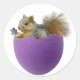 A squirrel sits in a purple eggshell holding a small blue flower. Use these Spring stickers this Easter.