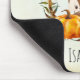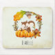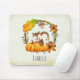 Personalised mousepad with a cute squirrel standing behind some orange watercolor pumpkins. A foliage wreath surrounds them with an oak leaf and orange flowers and other sprigs and leaves. Background is a cream colour, with a rough aged look around the edges.