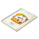 Spiral notebook with a cute squirrel standing behind some orange watercolor pumpkins. A foliage wreath surrounds them with an oak leaf and orange flowers and other sprigs and leaves. Background is a cream colour, with a rough aged look around the edges.