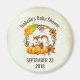 Baby shower event save the date magnet with a cute squirrel standing behind some orange watercolor pumpkins. A foliage wreath surrounds them with an oak leaf and orange flowers and other sprigs and leaves. Background is a cream colour, with a rough aged look around the edges.