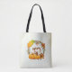 A shoulder tote with a cute squirrel standing behind some orange watercolor pumpkins. A foliage wreath surrounds them with an oak leaf and orange flowers and other sprigs and leaves. Background is a faux vintage parchment in a cream colour, with a rough aged lookaround the edges.