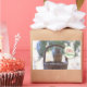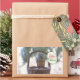 Photo of a fat squirrel sitting on a basket in the falling snow saying "Merry Christmas" in a speech balloon. Snow is piling up in this winter picture with a white background of fallen snow and the green branches of evergreen trees. "Merry Christmas" is written in red and red script. This photo of a squirrel in winter can be customised and printed on many different photo products.