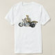 A squirrel rides a toy motorcycle, tail blowing in the wind.