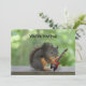 Photo of a squirrel playing a red and black electric guitar outside on a deck with trees behind it. The cute squirrel is smiling and holding the guitar, which has flames on it. A fun squirrel picture for guitarists!