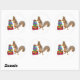 A squirrel with a party hat stands with a pile of presents. This fun birthday sticker would make a fun gift tag .