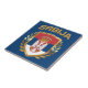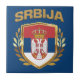 The national flag of Serbia is infused into a faux gold shield shape which itself, rest upon faux gold laurel leaves, The name of the country is added above the image.