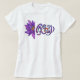 Close-up of a hand-painted design, featuring a blooming purple lotus flower on the left and the word "Sri Lanka" written in the Sinhala language on the right. The Sinhala script is stylised with curved lines and loops, rendered in shades of purple, blue, and a touch of orange. The lotus flower's petals are vividly coloured with gradients of purple, while its centre displays yellow stamens. The overall design combines nature-inspired imagery with cultural linguistic elements.