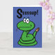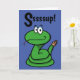 Funny green cartoon rattle snake. He has big oval eyes with raised eyebrows. A cheeky grin with his tongue sticking out. His long coiled body has a rattler on the tip of his tail. Over the snake in black lettering is a play on the word Sup! reading Sssssup!