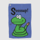 Funny green cartoon rattle snake with big oval eyes, a tongue sticking out of his cheeky grin and a rattle on the end of his tail. Above in black lettering is the word Sssssup! a play on the word Sup! The background is a blue colour.