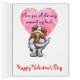 Animal Parade Romantic Saint Bernard Dog Heads and Tails in Love Valentine's Day Card brought to you by Imagine That! Design features our fun artwork of a brown and white St. Bernard dog holding a pretty rose in its mouth with layered purple, red, and pink hearts behind with the words, Be mine. Inside reads, I love you all the way around my back, and has the cute dog from behind. This sweet pup was digitally painted by our talented children's artist, Traci Van Wagoner. Perfect for Valentine's day, his or her birthday, for proposing marriage in a fun and original way, or just to say, I love you. Woof!