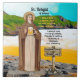 St. Brigid of Ireland (c. 451-c. 525) is the fourth saint featured in our Apron Series. A 6th-century Gaelic nun, St. Brigid founded the famous double monastery at Kildare (the “church of the oak") as well as several other Irish nunneries. She was a well-known miracle worker for the poor and is especially associated with beer. + Beer was an important staple of the medieval diet, not just a recreational drink. Safer to drink than the local, often polluted water, beer was considered a nutrient, earning a reputation as ‘liquid bread.’ In St. Brigid’s day, beer was a gruit, an herbal brew made from unmalted barley (Hordeum vulgare) and flavored with bog myrtle (Myrica gale) or meadowsweet (Filipendula ulmaria), not hops (Humulus lupulus). Hops were not used in Irish beer-making until the 16th century due to limited regional availability. + According to tradition, St. Brigid once turned ordinary bathwater into beer to provide for the patients of a leper colony when their supply ran dry. Similarly, another time, she turned bathwater into beer to fete the leper colony’s visiting clerics. Finally, one year, late in Holy Week, she miraculously furnished beer from Maundy Thursday until Easter Sunday to some 18 local churches from a single bottomless barrel. + So important was beer to her, St. Brigid wished even the saints in heaven and God Himself could enjoy its pleasures, allegedly authoring a poem to that effect that is quoted in part here. + In this artwork, St. Brigid holds an oversized glass beer mug or stein on the rocky shore of her imaginary lake of beer (identified in Old Irish and English on a weathered, wooden, AI-generated signpost from Pixabay). The figure of St. Brigid was extracted and modified from an 1881 commemorative devotional print (holy card) originally published in chromolithography by B. K. [B. Kühlen], at Mönchengladbach, Germany, and is from the designer’s private collection of religious ephemera. The beer lake background is a pastiche created by Saints_Aplenty from five separate Pixabay images. + Feast: February 1 (St. Brigid’s Day coincides with Imbolc, a traditional Gaelic seasonal festival with Celtic origins, marking the first day of spring in Ireland. Since 2023, St. Brigid’s Day has been celebrated as a national public holiday in her honor.) + NOTE WELL: The pictured scrollwork stand is NOT available. It is for display purposes only.
