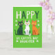This card features three stylised cats lined up front and centre on a bright lime green background, giving the whole scene a festive St. Patrick’s Day look 💚. One cat is emerald green, the next is white with green shamrock-like spots, and the third is a ginger tabby, all sitting neatly side by side as if posing together. Their yellow eyes and tiny pink noses add a teasing charm, and the little white fangs peeking out make them look like they’re sharing an inside joke with the viewer. The cats’ steady, front-facing gaze feels like a friendly nudge meant just for a daughter, with the trio’s close spacing suggesting a cosy, affectionate bond. Across the top, “HAPPY” is set in alternating dark green and white letters, spaced evenly above their heads. Along the bottom, “ST. CATTY’S DAY DAUGHTER” appears in large white text, centred and easy to read, with small white shamrocks floating around it ☘️. The background stays a solid lime green while the cats and lettering are outlined in thin black lines, and the white shamrocks dot the space like confetti.