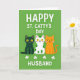 This card shows a lime green background with crisp white text across the top that reads “HAPPY ST. CATTY’S DAY HUSBAND,” setting a sweet, teasing tone 💚. Centred in the middle are three flat, stylised cats standing close together like they’ve leaned in for a friendly photo. The left cat is deep emerald green, the middle cat is white with green polka dots, and the right cat is warm orange with a gently curved tail that softens the lineup. All three have wide yellow eyes, small pink blush on their cheeks, and big smiles that feel like an inside joke shared with someone you love ☘️. Their simple faces and snug spacing make the scene feel cosy and affectionate without needing any extra flourishes. The lettering stays high and easy to read in white, leaving the cats to take up most of the centre space. Along the bottom, four white shamrocks are evenly spaced in a neat row beneath the cats.
