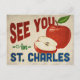 A charming St. Charles Missouri vintage travel postcard featuring a lovely red apple, along with fun retro style text that says, "See you in St. Charles"