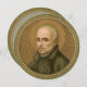 Spanish Basque nobleman and soldier turned priest and theologian, St. Ignatius Loyola (1491-1556) was founder and first Superior General of the Society of Jesus (the Jesuits). In this roundel, St. Ignatius is clad Jesuit style. He wears a simple black cassock, presumably wrapped and cinctured at the waist not buttoned down the front, and a collared black cape. On his chest, the Saint wears a Christogram, the official emblem of the Jesuits: the IHS monogram with the H surmounted by a cross above three nails and surrounded by a Sun. IHS (or iota-eta-sigma) stands for first three letters of the name of Jesus in Greek; the three nails, for the Passion; and the Sun, for the Son of God. Bound by a vow of special obedience to the Pope, the Jesuits undertook missionary work and education in orthodoxy under papal directives, playing an especially important role in the Counter-Reformation. The Jesuits’ motto in Latin coined by their founder is “Ad maiorem Dei gloriam (abbreviated AMDG)” and means "For the greater glory of God". + Feast: July 31 + Image Credit (BK 050): Antique image of St. Ignatius de Loyola, S.J., originally published in chromolithography by B. Kühlen, Mönchengladbach, Germany, unnumbered Jesuit Series, late 19th century, from the designer’s private collection of religious ephemera.