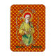 Though printed in Paris to advertise ‘Star Tapioca’ (Tapioca de L’Étoile), the St. Joseph in this example is clearly a variant of the aged St. Joseph, Patron of The Church, published as a devotional print by the Socièté de St. Augustin of Bruges, Belgium. (See our SAU 035 COLLECTION.) In fact, many of the saints in this series rely on Socièté de St. Augustin prototypes. In a less litigious age, the production of such derivative works was not uncommon. Not visible here are the carpenters (charpentiers) and slate-quarriers (ardoisiers) who labour under St. Joseph’s patronage. + In an ornate frame against a patterned backdrop of red and golden yellow, St. Joseph is clad in a yellow robe and green mantle. His hair has gone white. He holds an L-shaped carpenter’s rule emblematic of his profession in his right hand. In his left, instead of the more usual spray of white lilies of purity in full bloom, he holds a leafless stem of pink flowers that may be intended to represent spikenard. Spikenard is another flower associated with St. Joseph especially in Spanish-speaking countries. Given its funerary associations—spikenard was used in antiquity to anoint the dead—the flower may allude to St. Joseph’s approaching demise.