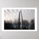 Unique view of the Gateway Arch in St. Louis. The Arch stands as a magnificent piece against the texture of clouds in the sky and above the treeline silouette.