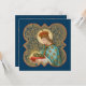 Believed to have been worn by Jesus during His Passion, the Crown of Thorns is one of the most important relics in Christendom. In 1238, King St. Louis IX acquired it for France from Baldwin II, the Latin Emperor of Constantinople. The French monarch received the Crown at the coastal town of Sens with great pomp and later installed it with solemn ceremonies in the chapel he especially built for it in Notre Dame in Paris. + Here St. Louis wears both halo and his own golden crown as well as an ermine-lined mantle in dark aqua that is decorated with gold fleur de lis. He reverently carries the Crown of Thorns, which emits spiked rays of light, on a plump red cushion. The scene takes place against a damask, tapestry-like background of gold florals on a dark blue field. The whole is enclosed in a barbed quatrefoil, a symmetrical shape formed by four overlapping circles atop an inscribed square that pierces its angles. It is a decorative design common in heraldry and in Mediaeval Christian art and architecture. + Epilog: Against all odds, the Crown of Thorns survived the French Revolution and was one of the relics rescued from a burning Notre Dame on Monday, 15 April 2019. + Feast of St. Louis the King: August 25 + Image Credit (BK 066): Detail from an antique devotional print of St. Louis IX the King originally published by B. Kühlen, Mönchengladbach, Germany, late 19th-early 20th century, from the designer’s private collection of religious ephemera.