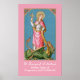 According to tradition, St. Margaret (or St. Marina the Great Martyr) laid down her life for Christ during Diocletian’s persecution at the beginning of the fourth century. Though a famous virgin martyr, ironically she is patron saint of expectant mothers and women in labor. The devil in the guise of a dragon, as this unusual patronage’s origin story goes, swallowed her whole. However, the cross she was carrying so irritated the dragon’s innards that he either egested her or ruptured to be rid of her. While even Medieval popes and hagiographers deemed this story fanciful, nevertheless, it was embraced by the laity and by artists if only for its symbolism. And, the cross and the dragon have been her principal attributes ever since. + This image of St. Margaret is particularly fetching. The saint, whose beauty was legendary, stands on the back of a large green dragon that tugs at her cloak with its teeth. She is crowned with a garland of roses, her long blonde hair flowing over her shoulders. She wears a bright pink mantle over a white tunic against a blue background patterned with little white dots and stars. + This product line emphasizes St. Margaret’s patronage of pregnancy and childbirth. The dominant pink and blue color scheme ties in well with the modern custom of using these colors for girl and boy babies. The mantle’s golden yellow lining allows for a gender-neutral theme. + Feast: July 20 + Image Credit (SAU 038): Antique NeoGothic goldprint with floral border of St. Margaret [of Antioch]”, originally published in chromolithography by the Socièté de St. Augustin, Bruges, Belgium, late 19th century, from the designer’s private collection of religious ephemera.