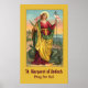 According to tradition, St. Margaret of Antioch (or St. Marina the Great Martyr) laid down her life for Christ during Diocletian’s persecution at the beginning of the fourth century. Our first St. Margaret of Antioch COLLECTION (SAU 038) emphasized Saint Margaret’s patronage of pregnancy and childbirth (q.v.). This one (M 016) emphasizes her patronage of dying people. + As the patronage origin story goes, the devil in the guise of a dragon once swallowed St. Margaret whole. However, the cross she was wearing or carrying so irritated the dragon’s innards that he either egested her or ruptured to be rid of her. While even Medieval popes and hagiographers deemed this story fanciful, nevertheless, it was embraced by the laity and by artists if only for its symbolism. The cross and the dragon have been her principal attributes ever since. + While the story remains the same, the spin that’s placed on it here makes a difference. Like the Old Testament tale of Jonah and the Whale, the story of St. Margaret and the Dragon is an analogy for Christ’s death, entombment, and resurrection from the dead. Clad in a belted dark red gown and enveloped in a golden yellow mantle with an emerald green lining, St. Margaret, stands over the carcass of a large green dragon. The dragon, Satan in disguise, represents evil incarnate. In her right hand, St. Margaret holds a palm of martyrdom; in her left, a Resurrection banner just like the one that the Risen Christ carries on Easter Sunday. (See our Easter COLLECTION for examples.) Typically, such banners are suspended from a standard or from a tall, thin cross and bear a red cross on a white field. Here the cross is more a salmon pink like the ribbon that binds her hair than the usual bright crimson red. Nevertheless, the banner’s symbolism is the same: it signifies victory, victory over death… and the promise of life eternal to true believers. + Feast: July 20 + Image Credit (M 016): Antique image of St Margaret [Margaritha] from a devotional print in chromolithography, original publisher unknown, late 19th century, from the designer’s private collection of religious ephemera.