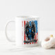 Every police officer needs a good police mug! St. Michael is the patron saint of law enforcement and here he holds a police baton in each hand. Christian police mugs. Handcuffs hang from his belt with a tattered American flag background. Religious police officer drink ware. Police across his chest and large angel wings. Defend Us in Battle banner. Mugs for police officers.