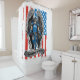 St. Michael shower curtain. St. Michael is the patron saint of law enforcement and here he holds a police baton in each hand. Handcuffs hang from his belt with an American flag background. Religious police officer bathroom shower curtain. Police across his chest and large angel wings. Defend Us in Battle banner. Shower curtain for police officers.