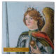 In this painting Three Archangels and Tobias by Francesco Botticini (1446-1498), a minor master of the Early Italian Renaissance, St. Michael heads up the column of travelers clad in contemporary 15th-century plate armour. Sword arm outstretched, he holds his weapon at the ready, ready to handle any danger on the road. St. Michael has auburn hair, a white openwork halo, red shoes, a short red cape with a green lining, and dark wings. In his free hand, he holds an orb, a symbol of authority, or a weight, a reference to his role in the weighing of souls at the Last Judgment. + Feast: September 29 + Image Credit (M 017): Detail of Three Archangels and Tobias, by Francesco Botticini (1446-1498), tempera on panel, 60 5/8” x 53 1/8” (154cm x 135cm), Florentine Italian, ca. 1470, Uffizi Gallery, Florence, Italy. {{PD-Art|PD-old-100}}. From an antique Stengel postcard in the designer’s private collection.