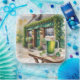 A watercolor painting of a charming Irish pub decorated for St. Patrick's Day, with emerald green shamrocks and festive banners adorning the rustic wooden exterior. The pub features a classic dark green door with brass fixtures and window boxes overflowing with vibrant green ivy and white flowers. On a small outdoor table sits a frothy green beer with a perfect foam head, surrounded by delicate four-leaf clovers scattered across the weathered wood surface. The entire scene is rendered in soft, flowing watercolor washes with gentle bleeding edges, creating a dreamy atmosphere filled with warm golden sunlight filtering through the Irish countryside.