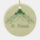 A beautiful St. Patrick double sided round ceramic ornament. Front features a wonderful stained glass look digital art of St. Patrick. The back reads 'St. Patrick' with a swirling leaves and shamrock design on top. A wonderful St. Patrick's Day or religious gift for family and friends. Please visit our store for more religious, patron saints, and digital art ornaments, gifts and greeting cards.
