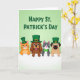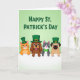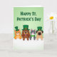 Designed with four friendly, human-like pets—two cats and two dogs—clustered along the bottom edge, this St. Patrick’s Day scene shows them leaning close together as if sharing an inside joke 💚. Their rounded faces and gentle smiles create a cozy, friendship-forward mood, with one long-eared dog sticking out a little pink tongue toward the group. A wide white banner runs horizontally across the lower middle, and the animals peek over its top edge with their paws resting along the border. Above them, the words “HAPPY ST. PATRICK’S DAY” sit near the top in large, dark lettering that stands out clearly against the background. The backdrop is a soft green gradient that shifts from lighter to deeper tones, giving the whole card a fresh, springtime look ☘️. Each pet wears a small green top hat with a golden buckle, and one gray-and-white cat adds a matching green bow tie for a sweet, affectionate touch. Fur colors vary from an orange tabby pattern to a fawn-toned, short-muzzled dog, all set under bright, even lighting with the white banner crisp and centered.