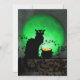 A silhouette of Théophile Steinlen's black cat for the Le Chat Noir club in a modern setting for St. Patrick's Day featuring the cat with green eyes, a green full moon, a vine with shamrocks, and a pot of gold.
