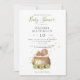 Baby shower invitation featuring a watercolor baby sleeping on a gold pot.