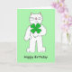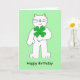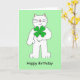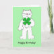 A cartoon of a large white cat holding a shamrock, set against a grass green coloured background.