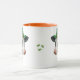 St. Patrick's Day mug featuring a watercolor image of a black and white cow adorned in a green top hat with a gold band and a white flower and shamrocks. Three small green shamrocks in front side of mug. Additional sizes and rim and handle colours available.