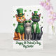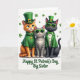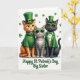 This card shows three dressed-up cats posed together on a bright white background, like close friends leaning in for a fun St. Patrick’s Day photo 💚. On the left, an orange tabby with turquoise eyes wears a green top hat and a green hoodie, with a small gold shamrock pendant resting at the chest. In the center, a calm grey cat faces forward in lime green sunglasses, standing close enough to the others to suggest an easy, familiar bond. On the right, a black cat in green shades wears a tiny green top hat, a suit jacket over a white shirt with green buttons, and a green bow tie, giving the group a slightly dressed-up, affectionate “we match” look. Around them, small green shamrocks are scattered lightly across the white space, adding a festive touch without crowding the trio ☘️. The greeting “Happy St. Patrick’s Day Big Sister” appears as green lettering near the lower portion of the design, centered beneath the cats. The overall scene stays airy and bright, with the cats’ emerald accessories and the scattered shamrocks standing out crisply against the white backdrop.
