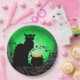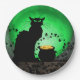 A silhouette of Théophile Steinlen's black cat for the Le Chat Noir club in a modern setting for St. Patrick's Day featuring the cat with green eyes, a green full moon, a vine with shamrocks, and a pot of gold.